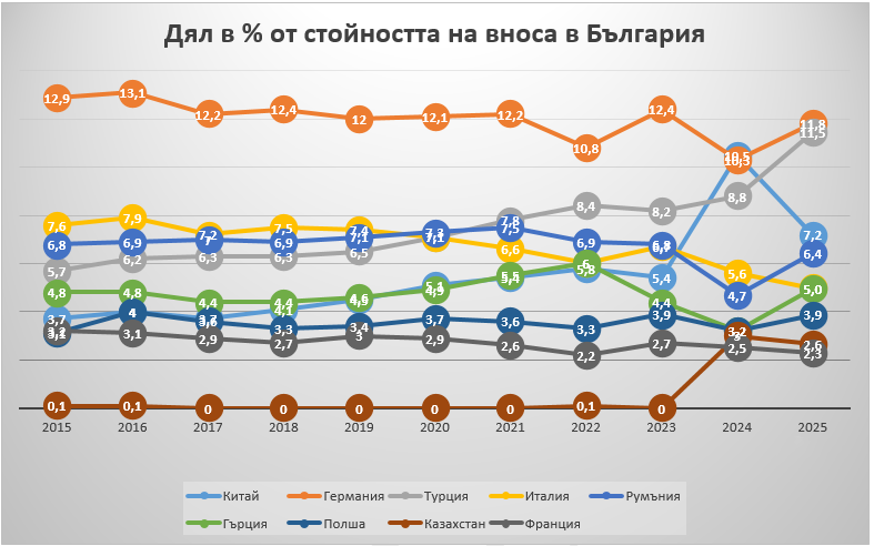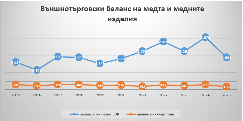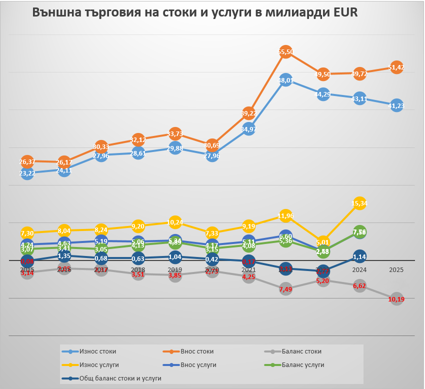 Представяме данни за българската външна търговия със стоки и услуги от световната база данни www.trademap.org в евро и в тона за период от 2015-2025 г.. При стокообмена числата са структурирани съгласно Хармонизираната система за кодиране и описание на стоките (ХС) на СМО, която е световната номенклатура на митническите тарифи. Главите от ХС в значителна степен съответстват на секторите на икономиката. Данните за цялата 2025 са авторска прогноза на база екстраполация на първите 6 месеца на годината с отчитане на сезонността към септември 2025 г. Графично представени баланси (разликата между износа и вноса) са световно сравнимите „резултати от лабораторни изследвания“ за състоянието и тенденциите в българската икономика. В настоящият графичен анализ са представени само някои водещи позиции (с близо милиарден и повече дял в износа в евро) за тези единадесет години. Това са изходни данни, а не цялостен анализ или диагноза. Поради силно отворения характер на българската икономика и съществуващата динамична геополитическа обстановка в света, те трябва внимателно, постоянно и подробно да бъдат проследявани и изследвани.