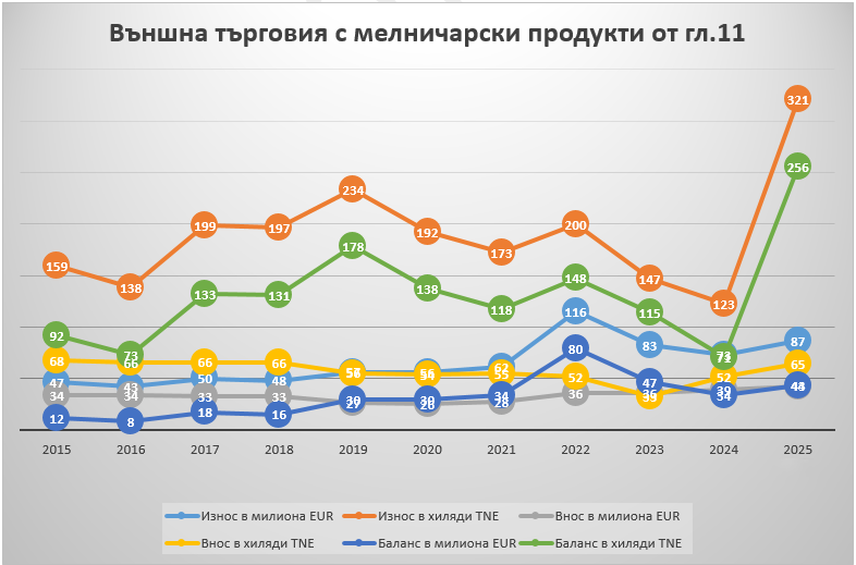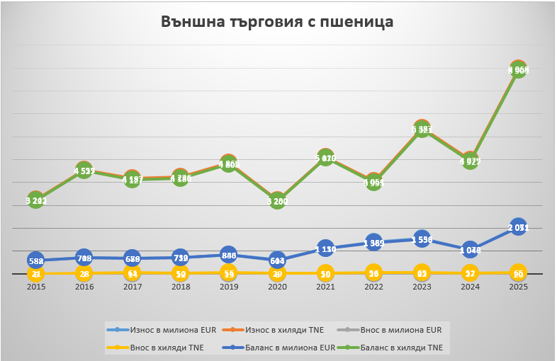 Положителния външно-търговски баланс при износа на пшеница и мелничарски продукти близо три пъти расте както в натура така и в евро.