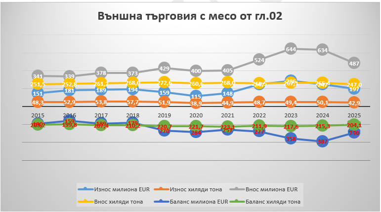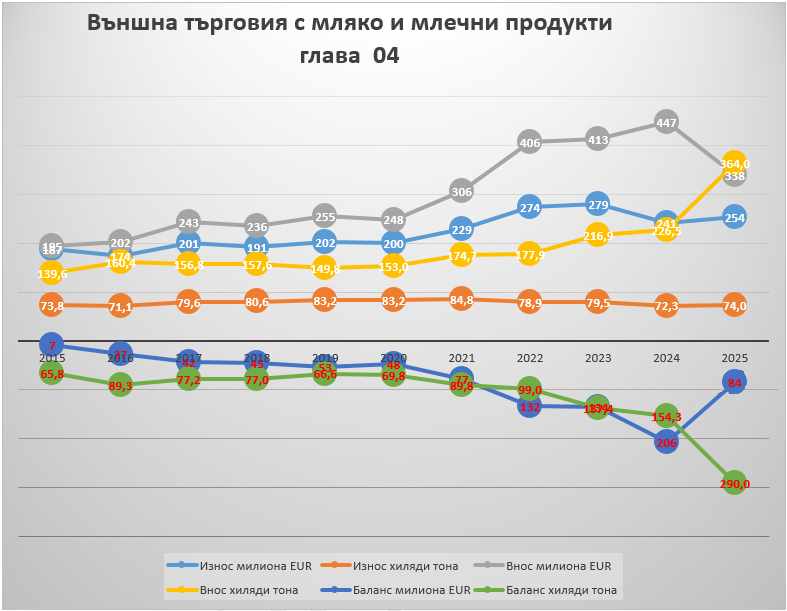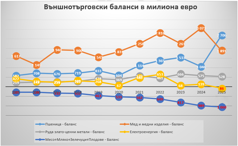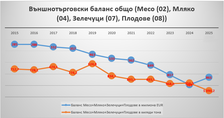 Общият отрицателен външно-търговски баланс на храни (съгласно числата от главите на митническата тарифа за месо, мляко, зеленчуци и плодове) за последните единадесет години се влошава почти три пъти в евро и близо един път и половина пъти в натура. Повече от десетилетие ние вече не сме самодостатъчни в изхранването.
