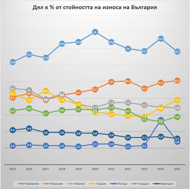 Географията на износа и вноса - външнотърговски партньори на България за този период, формиращи общо поне 50 % от стойността на българския износ или внос са: