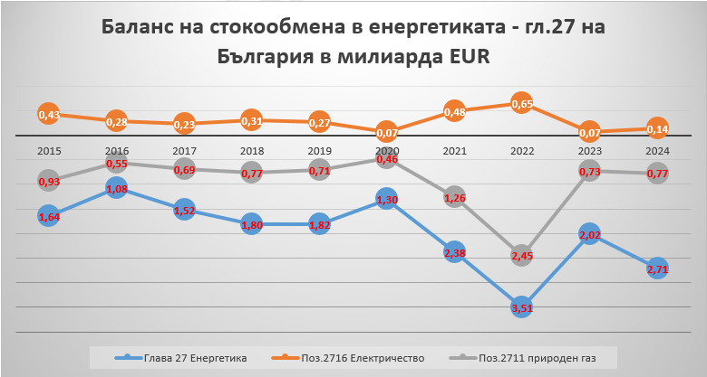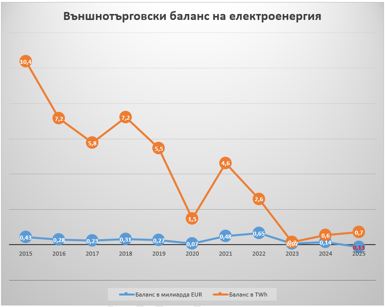 Последните единадесет години България има повече от десетократно намаление на положителния баланс в електричеството измервано в натура. За енергетика (вкл. природния газ) за този период има близо два пъти увеличение на отрицателния външнотърговски баланс в евро.